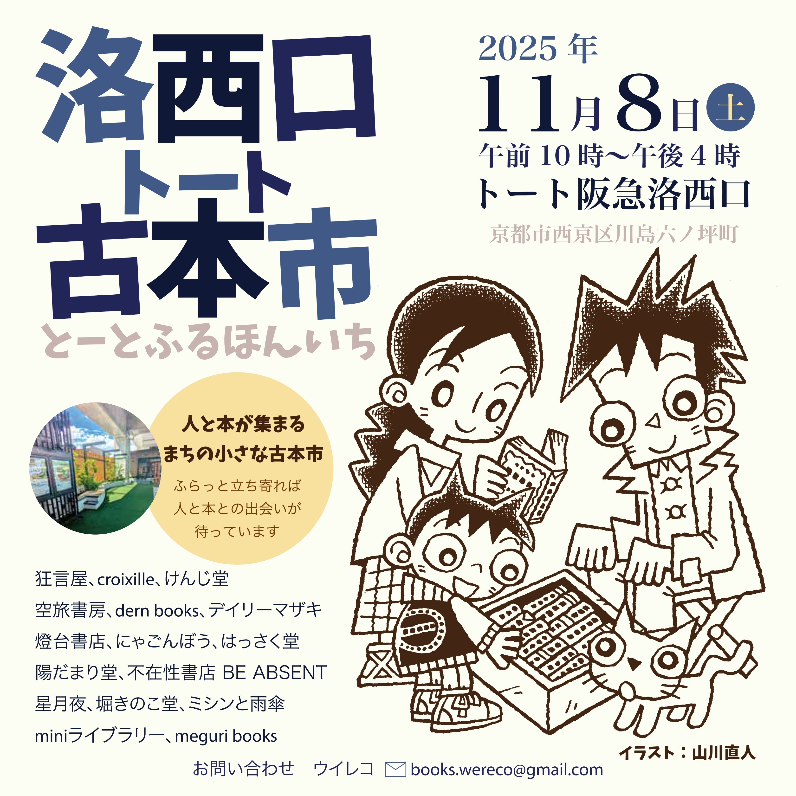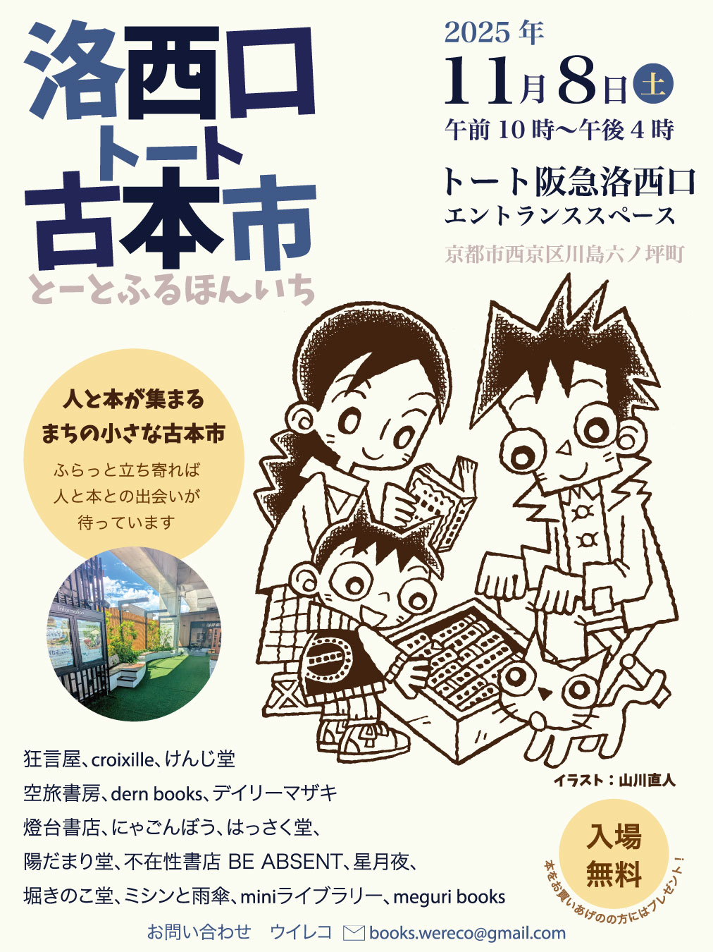 今回,イラストを漫画家の山川直人先生に描いて頂きました.とても可愛い素敵なイラストです.子どもから大人まで楽しめる場としての古本市を目指していますが、まさにそのものといった感じのイラストでとても気に入っています.この古本市が続く限り,洛西口トート古本市のビジョンとして大切にしたいと思っています.(山川直人先生からもXでコメントを頂きました!)